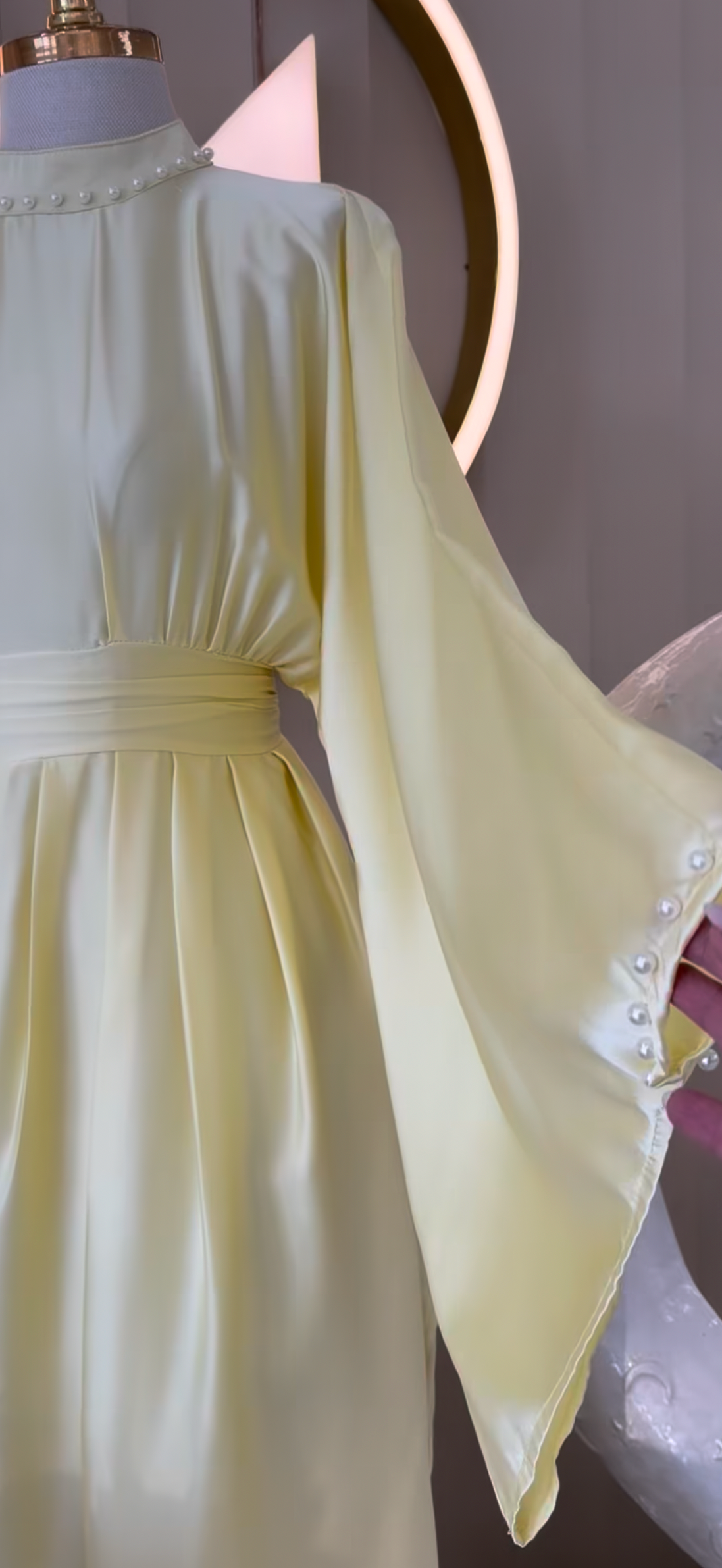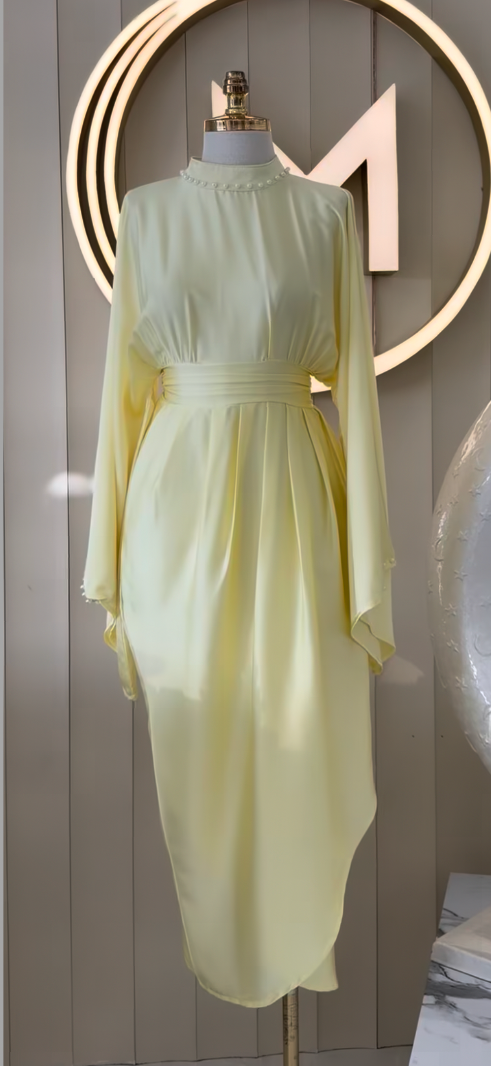 שמלת אלגנטית בגוון צהוב רך ומאיר, המעניקה מראה נשי, עדין ומרשים בו זמנית. השמלה מעוצבת בגזרה מחמיאה עם מותן מודגשת וחצאית נשפכת באורך מידי ליצירת סילואטה מאוזנת ואלגנטית.