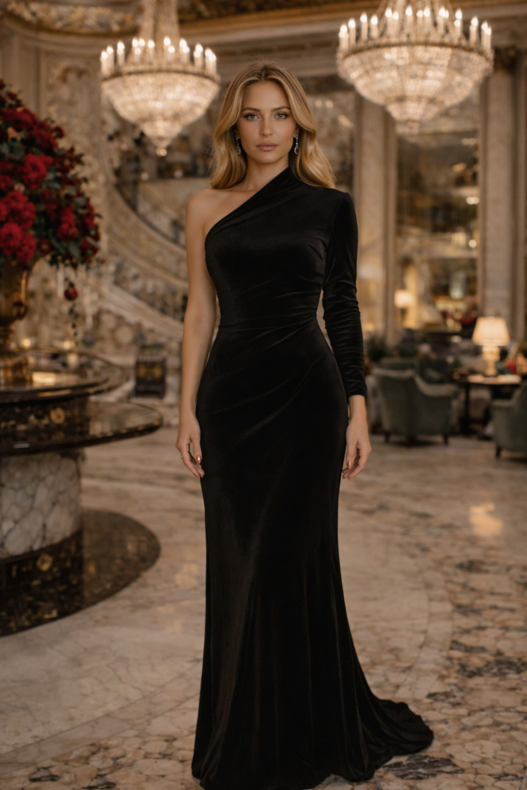 שמלת ערב יוקרתית ומרשימה מבד קטיפה רך ונעים בגוון ירוק עמוק ועשיר. השמלה מעוצבת בגזרת מקסי מחמיאה הנשפכת לאורך הגוף, עם שרוול ארוך בצד אחד ועיצוב א-סימטרי אלגנטי.