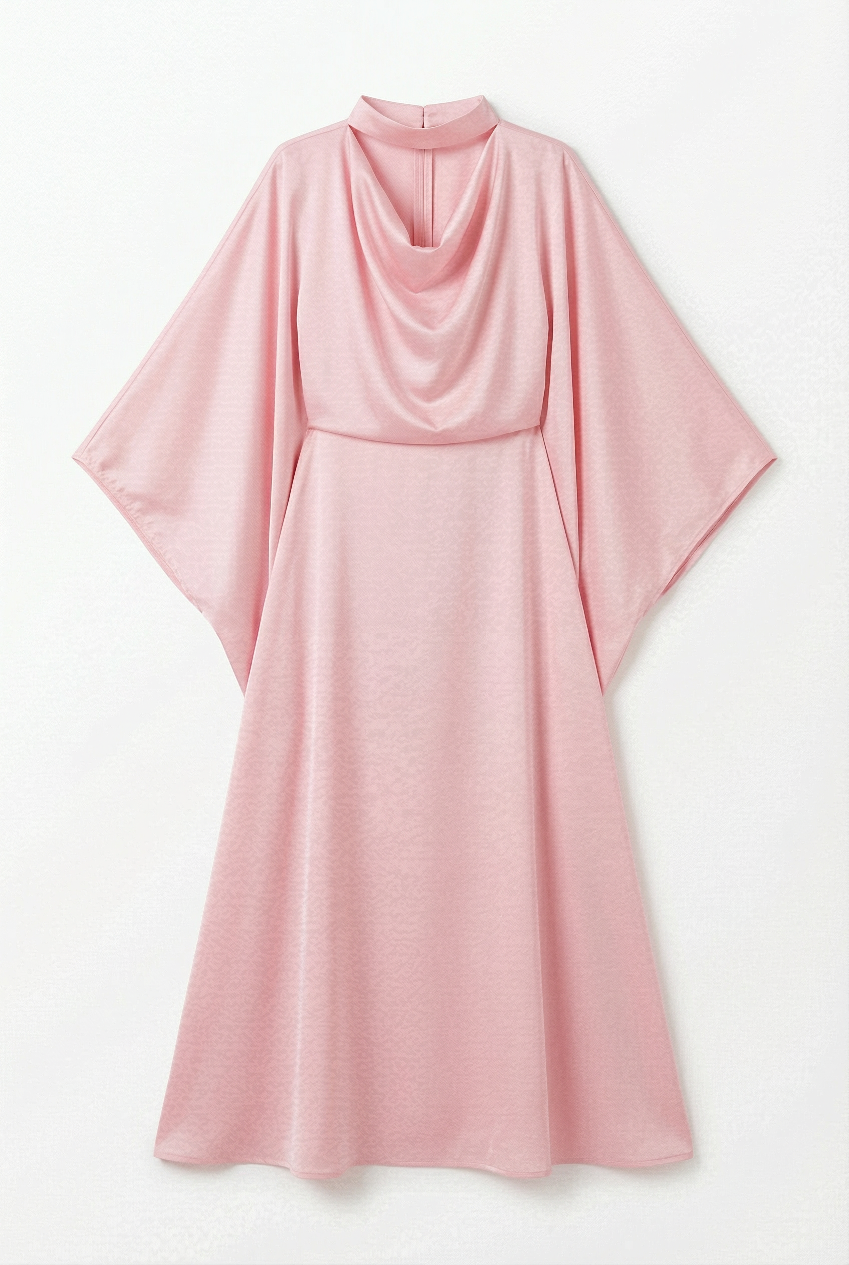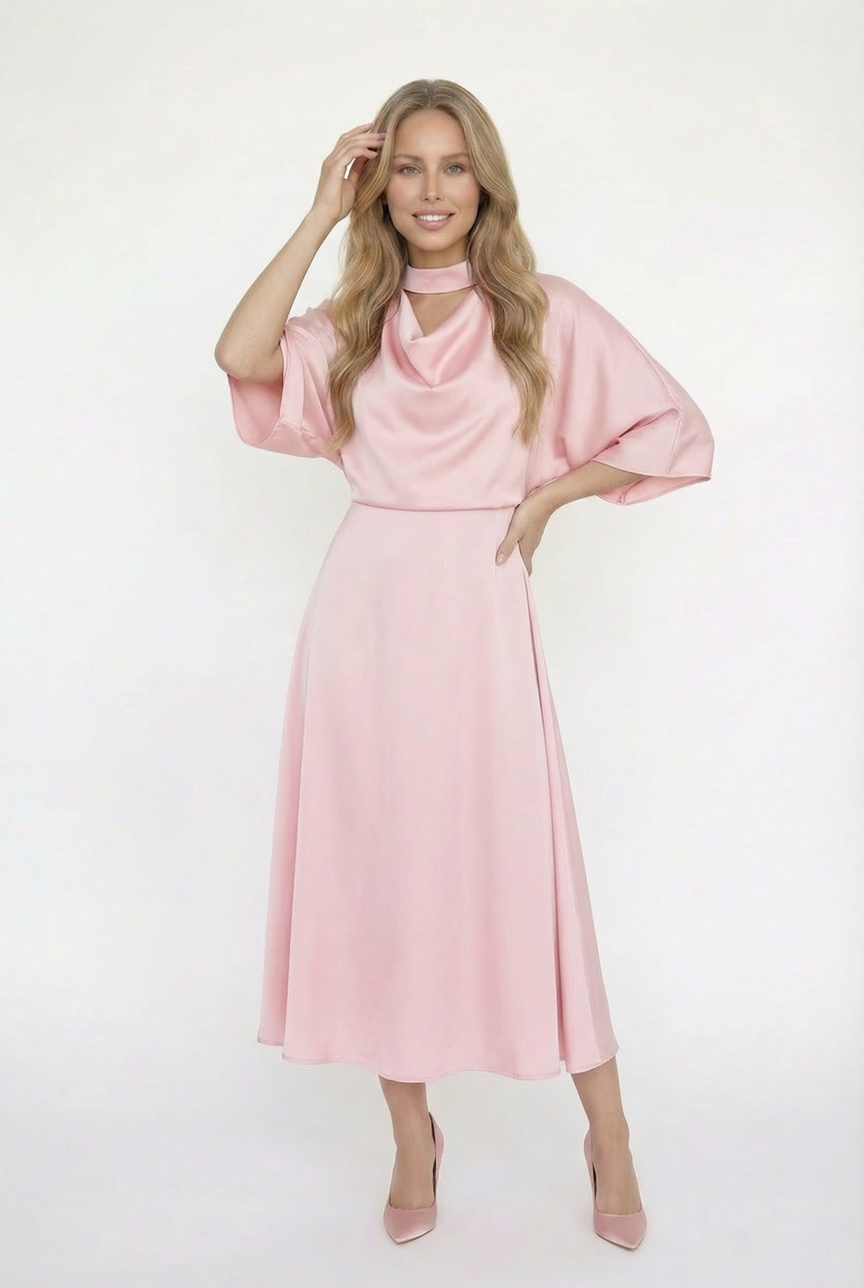 שמלת אביה משיפון בגוון ורוד עדין בעיצוב נשי, רך ואלגנטי במיוחד. הדגם כולל מחשוף נשפך בסגנון דרייפ עדין המעניק מראה יוקרתי וזורם, לצד צווארון צמוד עם פתיחת טיפה מחמיאה המדגישה את אזור הצוואר והכתפיים.